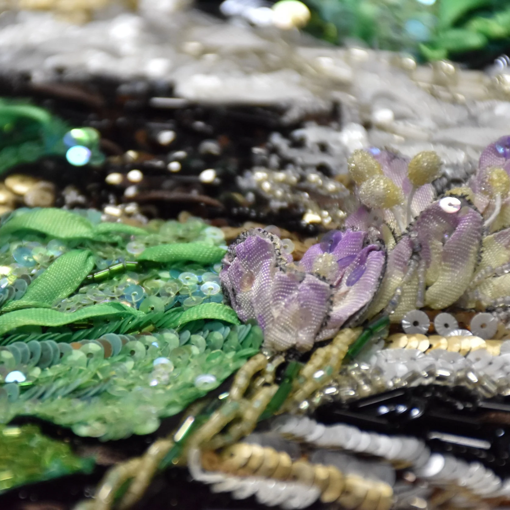 資材の選定: 1920年代のヴィンテージビーズや希少なフランス製メタリック糸など、一期一会の資材を使用します。これらは在庫が限られているため、同一のデザインであっても細部の素材感が異なる「世界に一つの表情」となります。